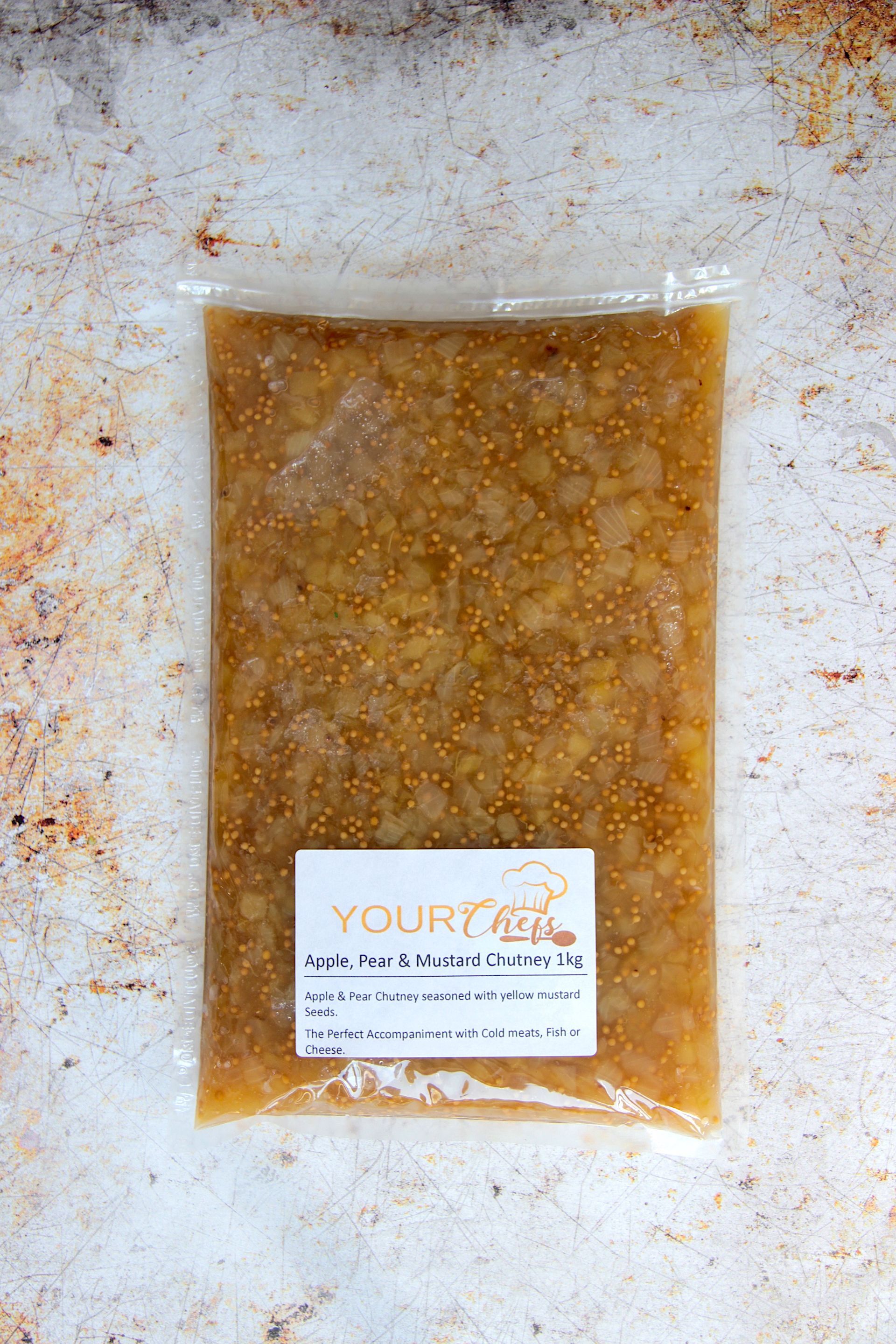 Apple & Pear Chutney seasoned with yellow mustard Seeds. The Perfect Accompaniment with Cold meats, Fish or Cheese.