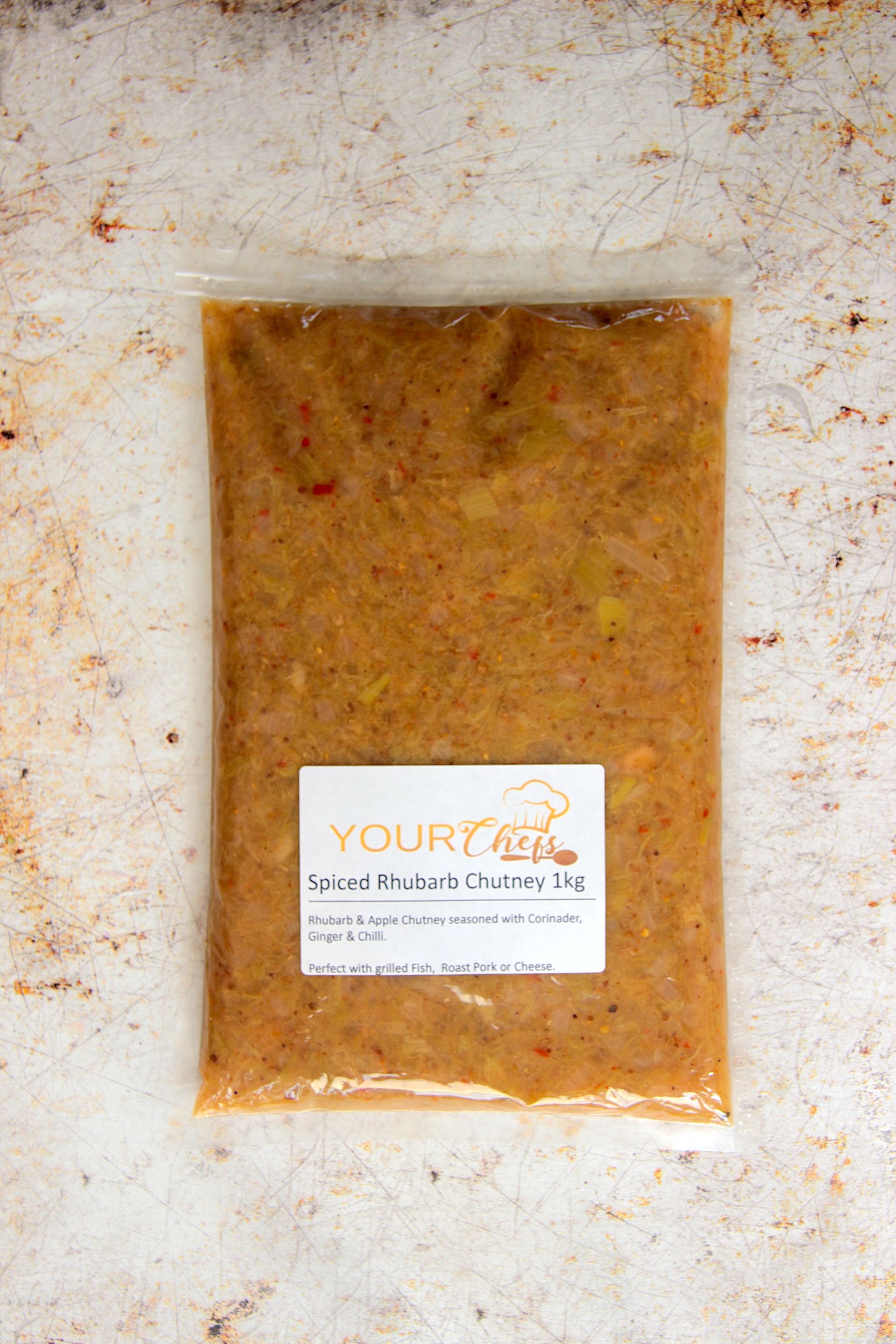 Rhubarb & Apple Chutney seasoned with Coriander, Ginger & Chilli. Perfect with grilled Fish, Roast Pork or Cheese.