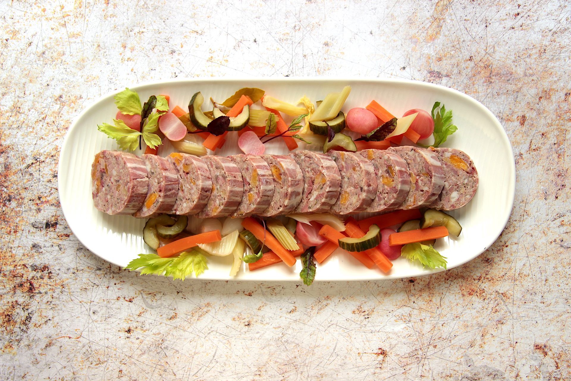 A coarse Pork Pâté with Bacon, Chicken livers and Apricots, seasoned with Sage and Marjoram.